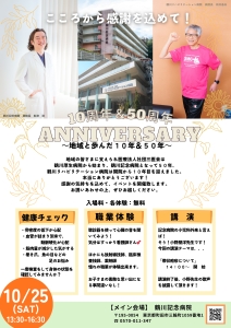 地域の皆さまに支えられ、鶴川記念病院は50周年、 鶴川リハビリテーション病院は10周年を迎えました。 感謝の気持ちを込めて、イベントを開催致します。 お誘いあわせの上、ぜひお越しください。